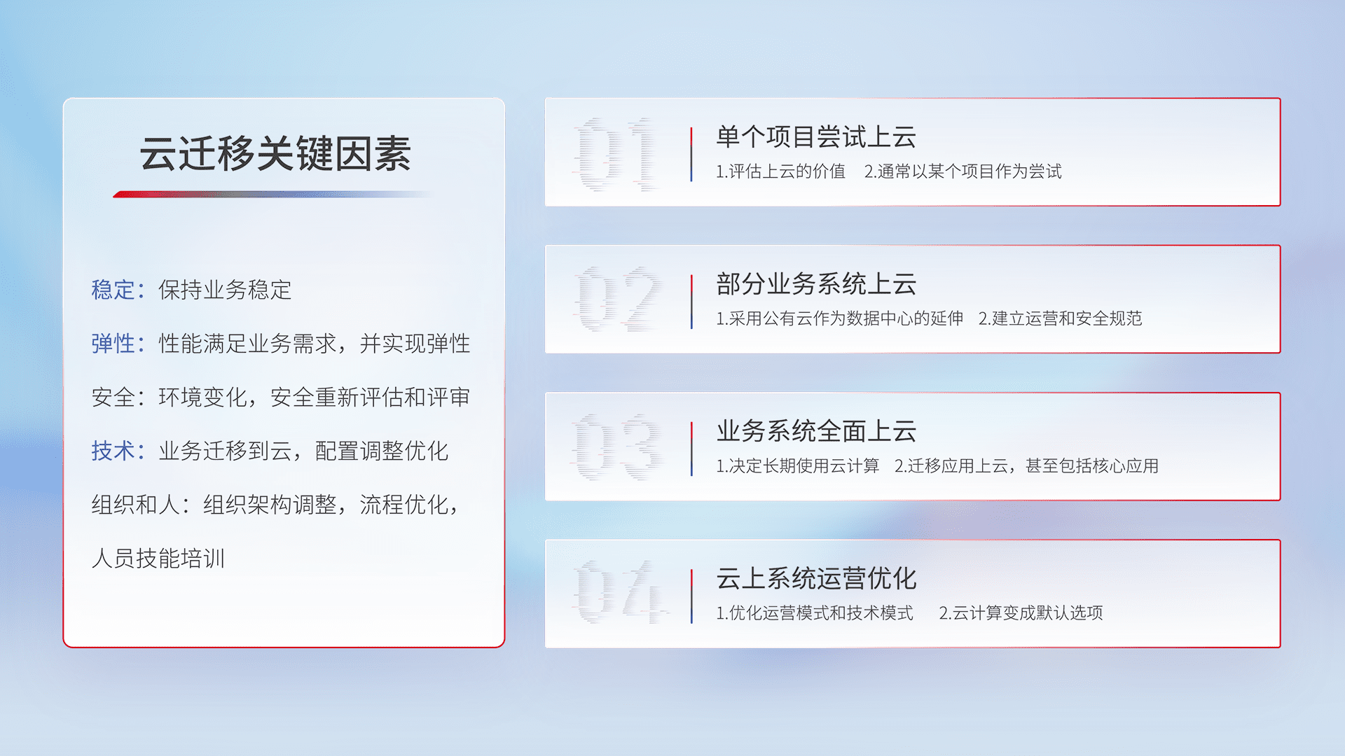 结合实际业务,,从规划设计、、云平台选型、、、、云原生改造、、数据迁移、、集成交付,,迁移全过程为客户识别最佳上云路径,,,做好风险识别管理,,,设计网络架构、、身份权限、、、、安全审计合规、、操作审计、、、日志审计、、、监控告警策略、、多站点容灾设计等,,对云上基础设施进行整体规划,,,,提升IT治理水平,,以满足弹性、、、高可用、、、、高性能的需求。。。
